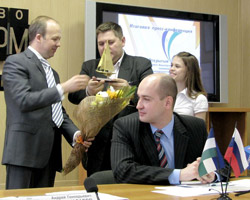 Пресс-конференция началась с радостной ноты: агентство «Башинформ» поздравило Андрея Назарова с днем рождения, который совпал с сегодняшним мероприятием, и вручило ему символический подарок – золотой кораблик с пожеланием, чтобы корабли всегда возвращались в родную гавань Башкортостана.