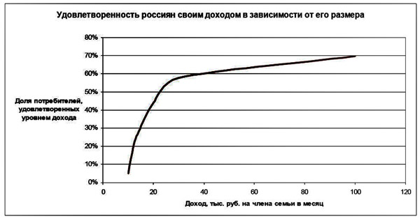 Согласно ему, 40% россиян были бы вполне довольны своими доходами, если бы они составляли 20 тысяч рублей на каждого члена семьи. Если бы доходы были на уровне 40 тысяч на человека, то удовлетворение почувствовали бы уже 60% населения. На основании графика исследователи утверждают, что половина россиян будет удовлетворена своим благосостоянием, когда их доход достигнет 22 тыс. рублей на члена семьи в месяц.