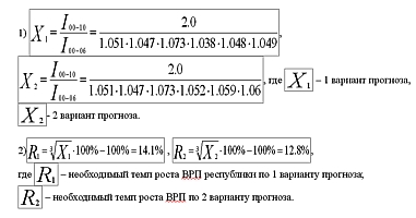 Для удвоения ВВП и ВРП к 2010 г. необходимый ежегодный темп роста должен быть равным 7,2 %: , где «2» собственно и означает удвоение ВВП, т. е. берем этот показатель за некий общий тренд экономического роста. Однако существуют ежегодные фактические темпы роста ВВП и ВРП, и учитывая эти темпы, необходимо было пересчитывать планируемые показатели роста для обеспечения удвоения к 2010 году. Можно рассмотреть такой расчёт на примере ВВП РФ.