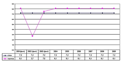 На рис.3 представлена необходимая траектория роста ВРП Республики Башкортостан, начиная с 2004 года (с учётом фактических данных на 2001–2003 годы), в целях достижения республикой поставленной задачи – удвоение ВРП.