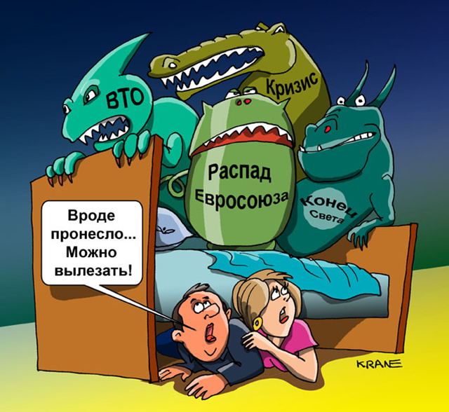 29 декабря 2012 Пять главных страхов и надежд 2013 года Декабрь – время подведения итогов. Мы составили собственный рейтинг самых важных и обсуждаемых событий в финансовой сфере. Год несбывшихся страхов В этом году как никогда были сильны ожидания Апокалипсиса – как в финансовой сфере, так и вполне реального, с громом и молниями. Финансисты и экономисты с мировым именем взахлеб предрекали то распад еврозоны и изгнание из валютного союза переживающих не самые простые времена Греции, Италии, Испании, Португалии, Исландии (список то укорачивался, то пополнялся новыми названиями). В США, в которых, затаив дыхание, следили на напряженной гонкой в президентских выборах (интрига сохранялась до последнего момента), финансовые чиновники с завидной регулярностью подкидывали плохие вести: то о росте безработицы, то о стагнации промышленности, то о грядущем фискальном обрыве (вот еще один новый термин в копилочку). Биржевики седели, наблюдая продолжающееся замедление темпов экономического роста в Китае, который в последние годы уже привычно считается двигателем мировой экономики. А жители планеты, которых мало интересуют перипетии и невидимые войны финансового мира, вели отсчет дней, оставшихся до конца света. Точная дата Апокалипсиса была выбита в каменном календаре древнего народа майя. И сотни, сотни тысяч людей, поддавшись истерии, отдавали бешеные деньги за места в подземных бункерах и делали месячные запасы тушенки, спичек, свечей и туалетной бумаги. Российский бизнес видел апокалипсис во вступлении России в ВТО. Но и тут, кажется, пронесло. Вымученным результатом долгих, долгих, долгих согласований вхождения страны в ВТО стали договоренности, по которым Россия не получила особенных бонусов и преференций, но защитила интересы отечественных производителей в ключевых отраслях. Стоила ли игра свеч, еще предстоит оценить. Осенний всплеск инфляции